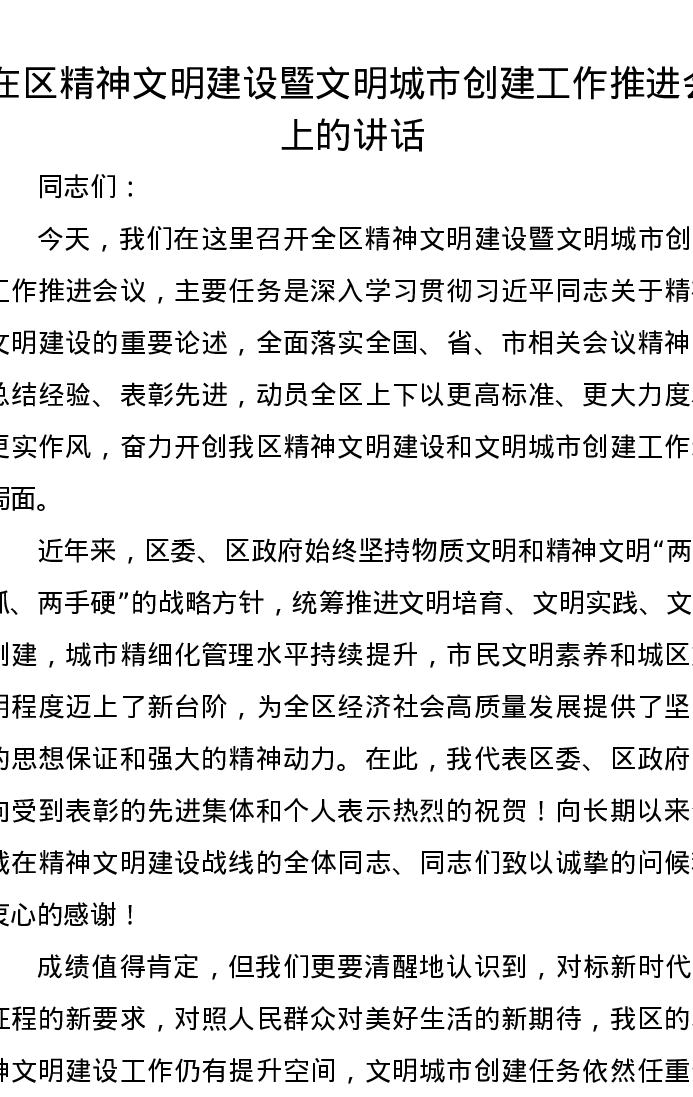 在区精神文明建设暨文明城市创建工作推进会上的讲话