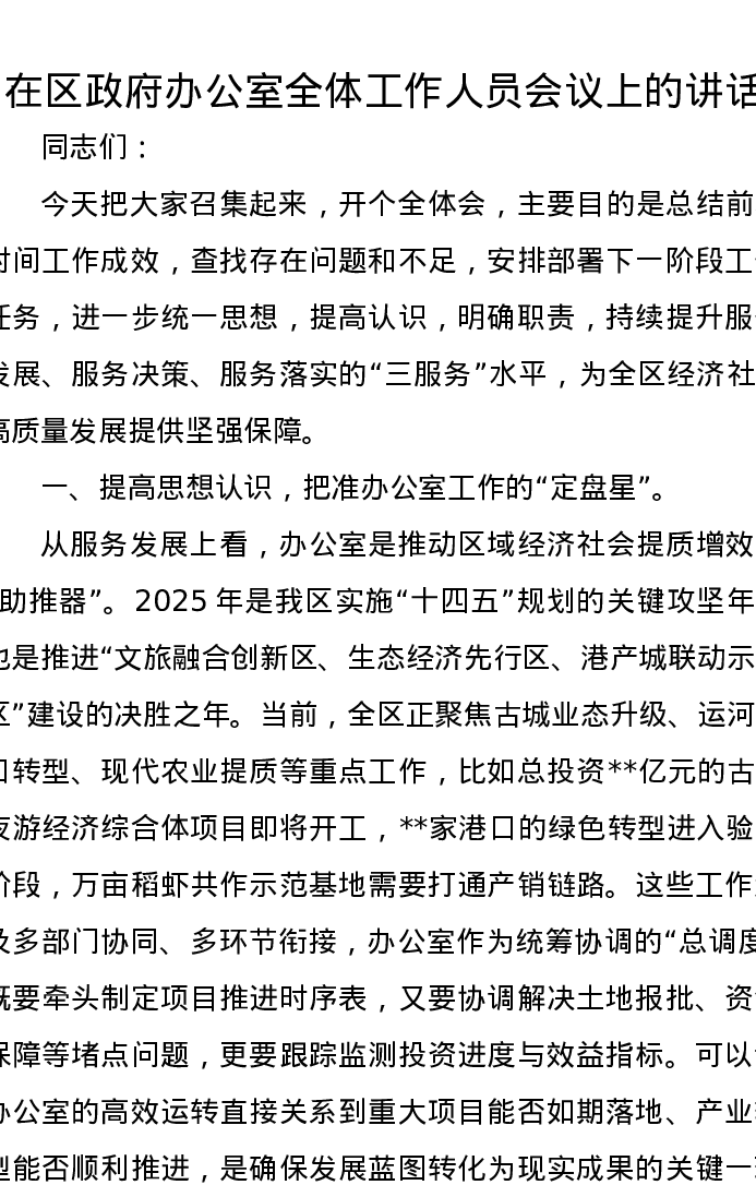 在区政府办公室全体工作人员会议上的讲话