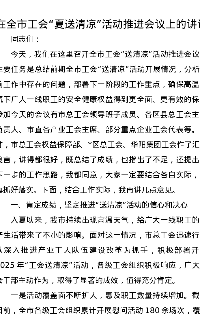 在全市工会“夏送清凉”活动推进会议上的讲话