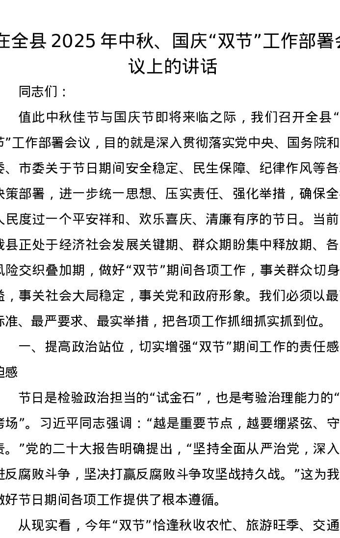 在全县2025年中秋、国庆“双节”工作部署会议上的讲话