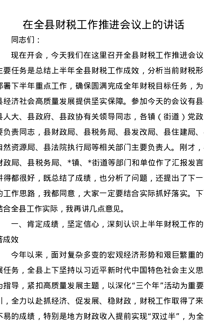 在全县财税工作推进会议上的讲话