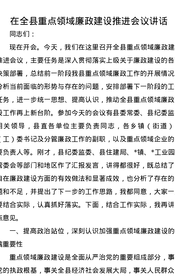 在全县重点领域廉政建设推进会议讲话
