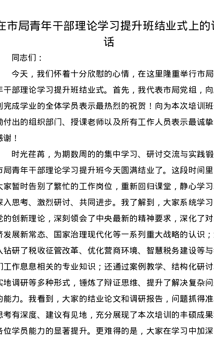 在市局青年干部理论学习提升班结业式上的讲话
