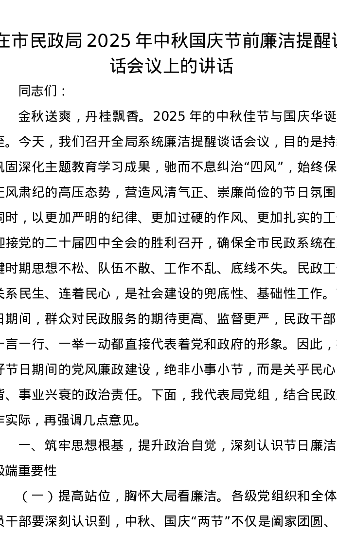 在市民政局2025年中秋国庆节前廉洁提醒谈话会议上的讲话