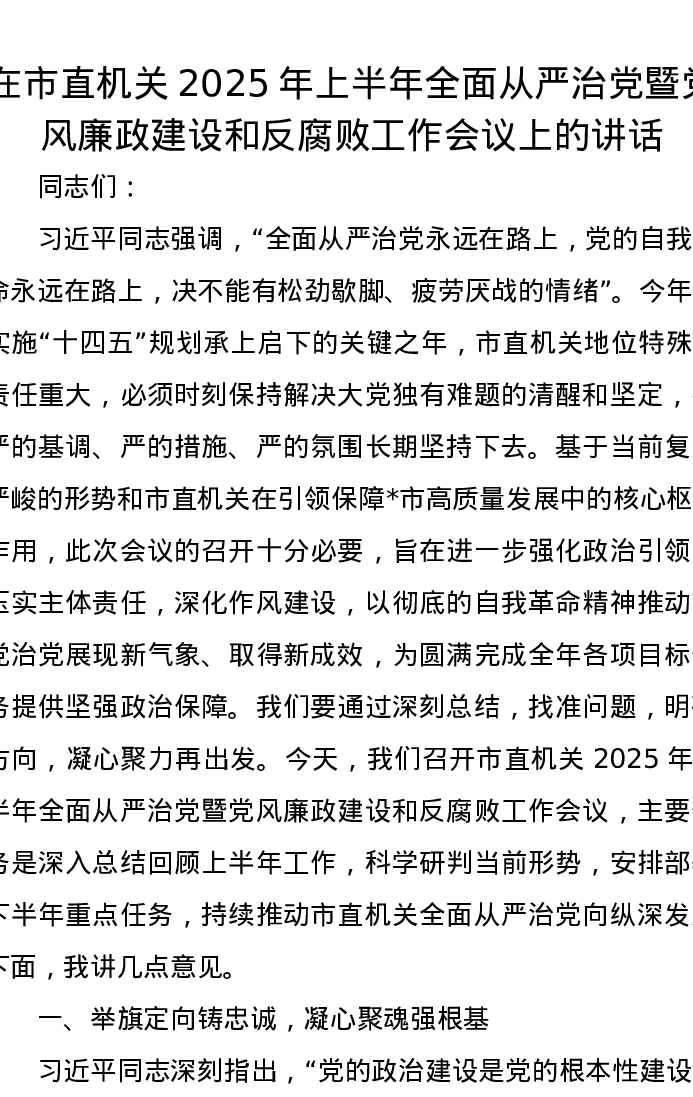在市直机关2025年上半年全面从严治党暨党风廉政建设和反腐败工作会议上的讲话