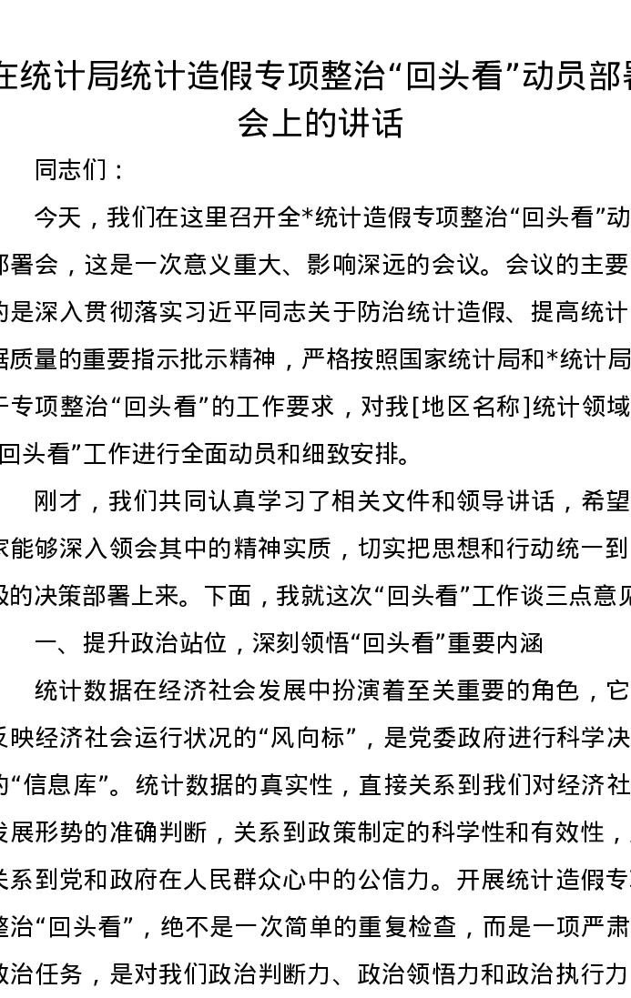 在统计局统计造假专项整治“回头看”动员部署会上的讲话