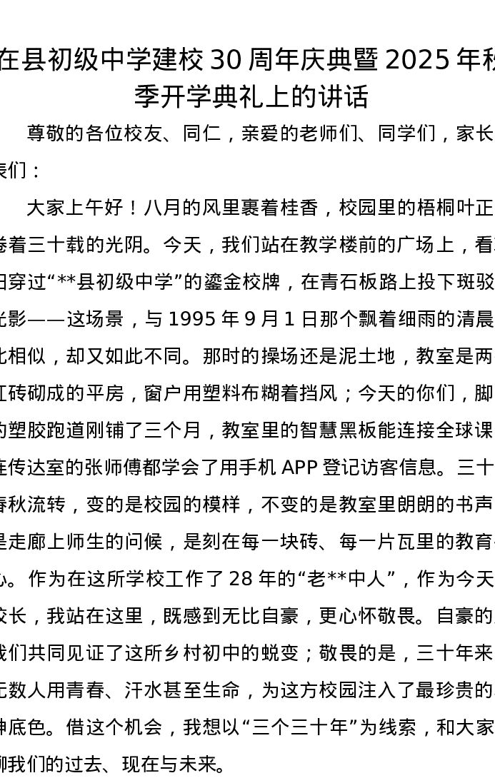 在县初级中学建校30周年庆典暨2025年秋季开学典礼上的讲话