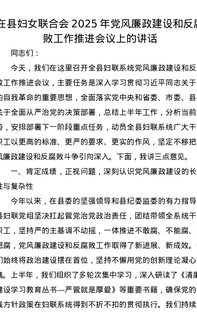 在县妇女联合会2025年党风廉政建设和反腐败工作推进会议上的讲话