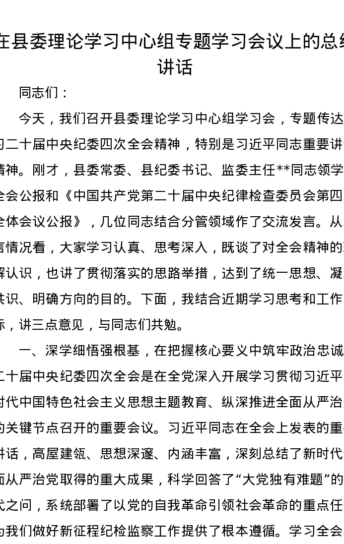 在县委理论学习中心组专题学习会议上的总结讲话
