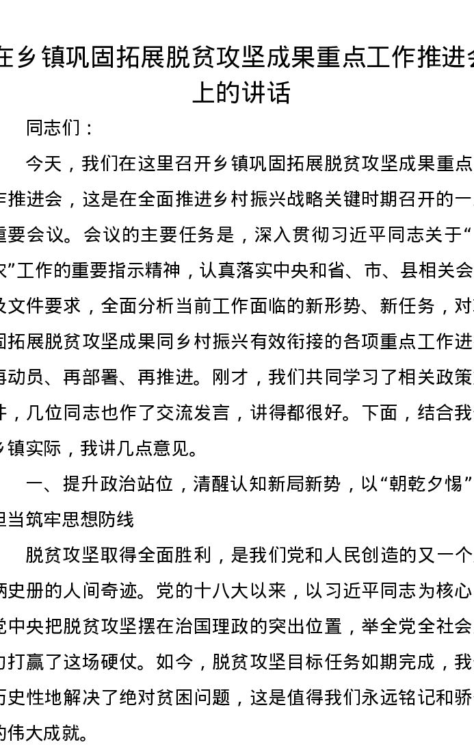 在乡镇巩固拓展脱贫攻坚成果重点工作推进会上的讲话