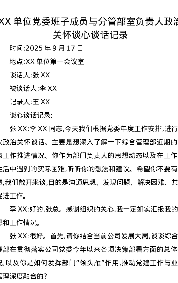 XX单位党委班子成员与分管部室负责人政治关怀谈心谈话记录