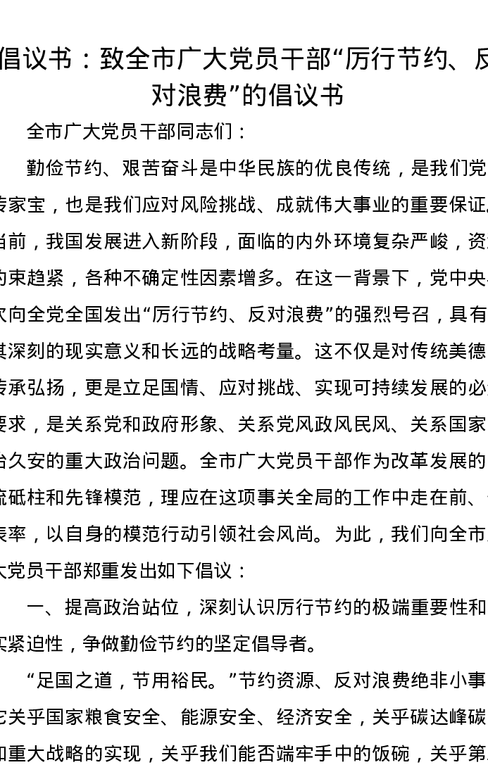 倡议书:致全市广大党员干部 “厉行节约、反对浪费” 的倡议书