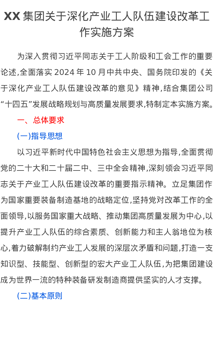 XX集团关于深化产业工人队伍建设改革工作实施方案