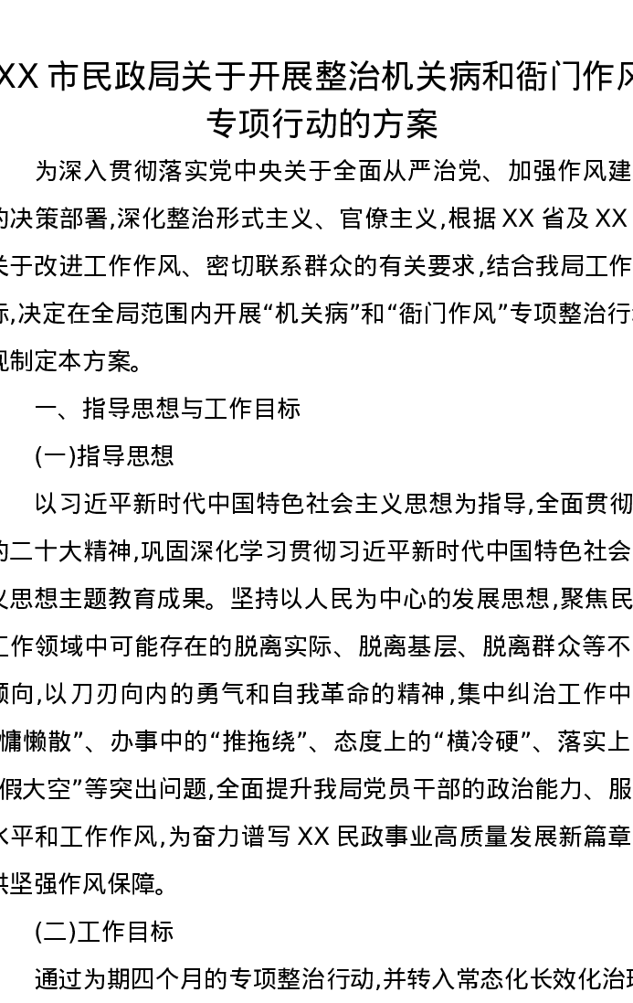 XX市民政局关于开展整治机关病和衙门作风专项行动的方案