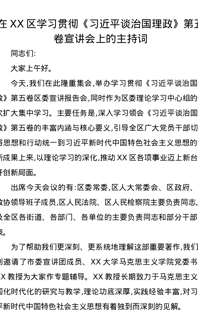 在XX区学习贯彻《习近平谈治国理政》第五卷宣讲会上的主持词