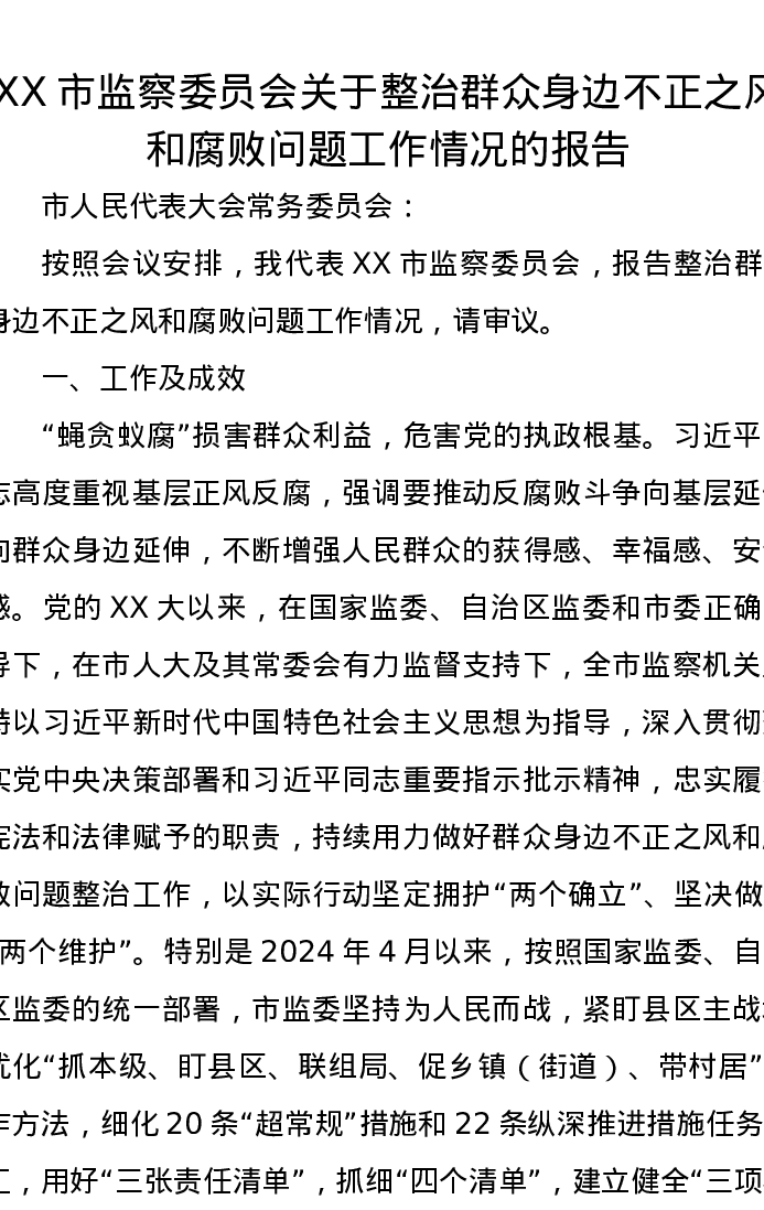 XX市监察委员会关于整治群众身边不正之风和腐败问题工作情况的报告