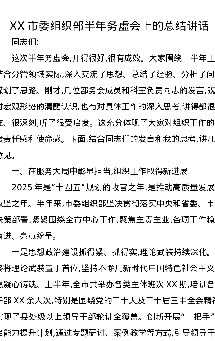 XX市委组织部半年务虚会上的总结讲话