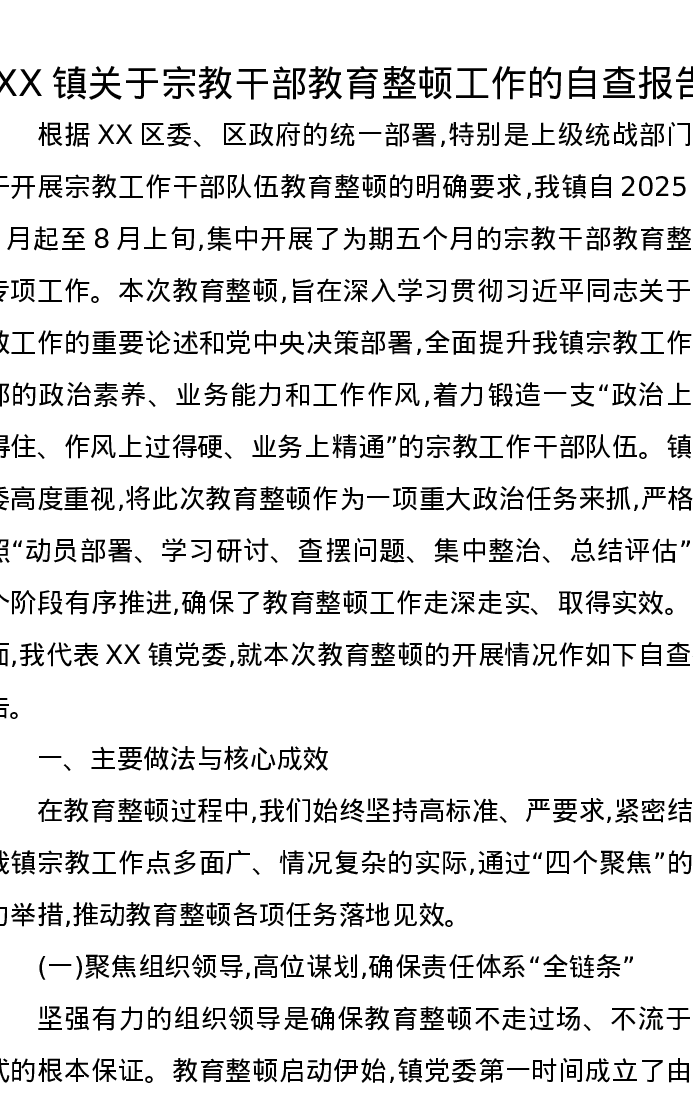 XX镇关于宗教干部教育整顿工作的自查报告