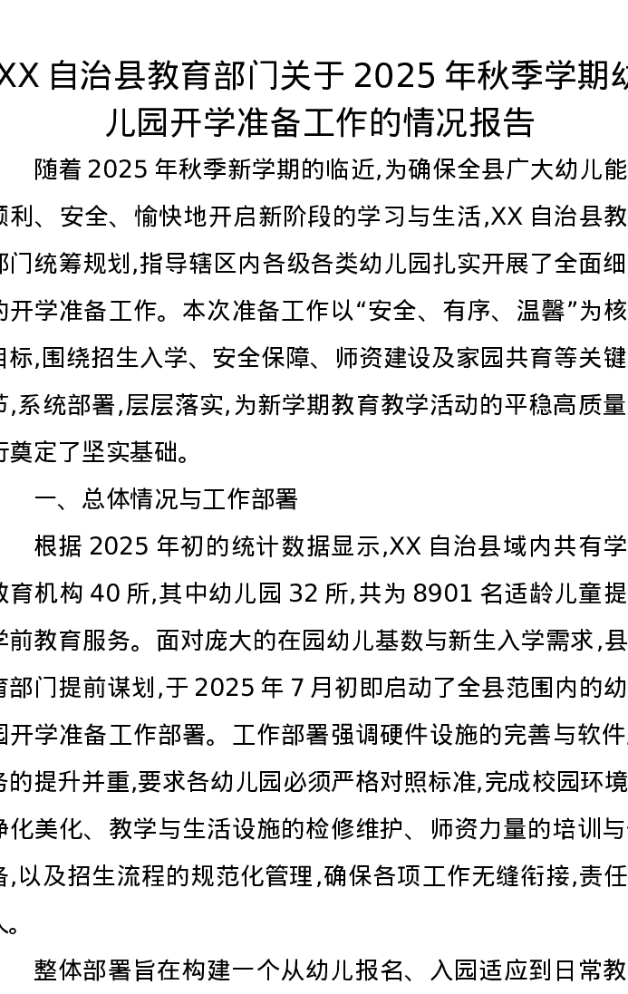 XX自治县教育部门关于2025年秋季学期幼儿园开学准备工作的情况报告