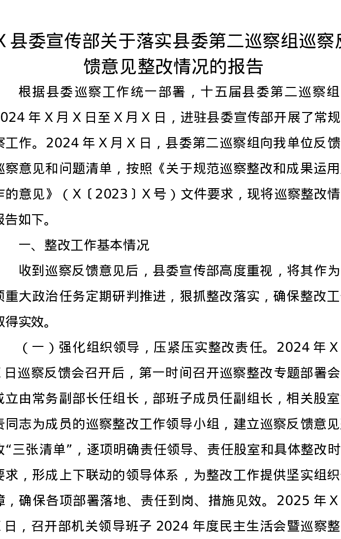 X县委宣传部关于落实县委第二巡察组巡察反馈意见整改情况的报告