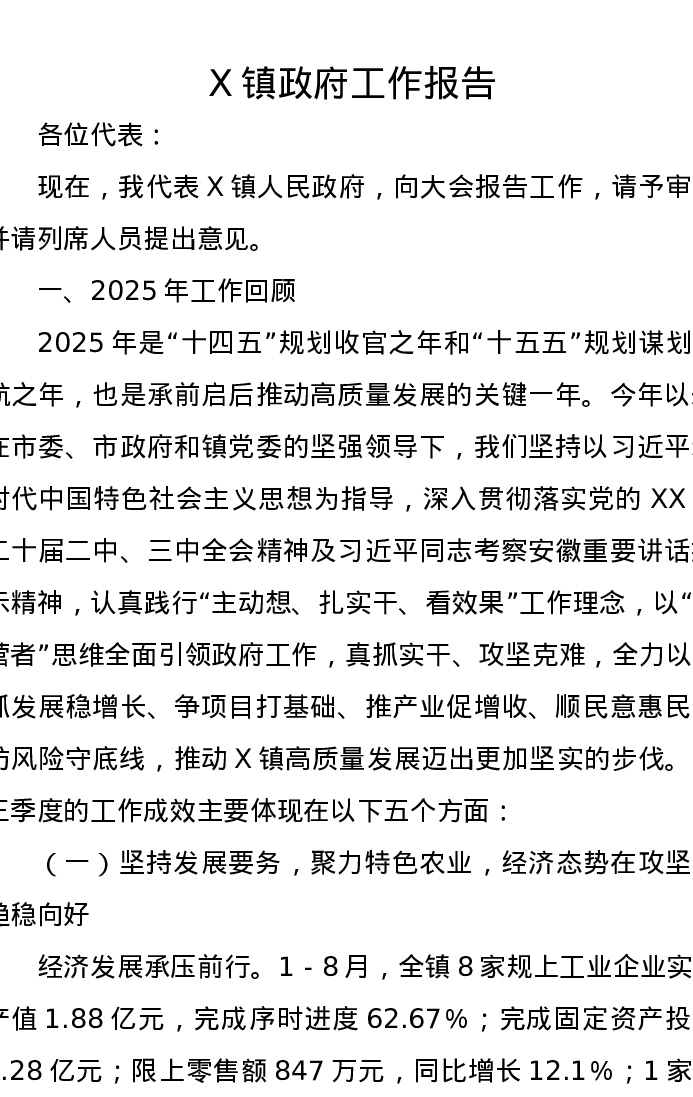 X镇政府工作报告