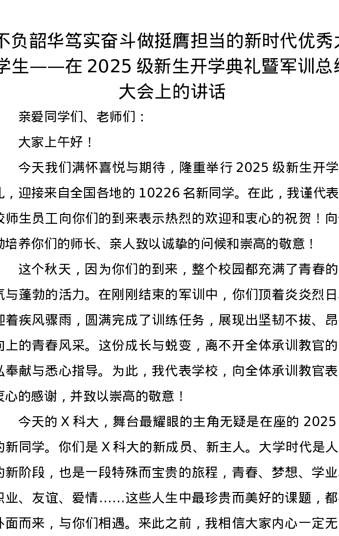 不负韶华笃实奋斗做挺膺担当的新时代优秀大学生——在2025级新生开学典礼暨军训总结大会上的讲话