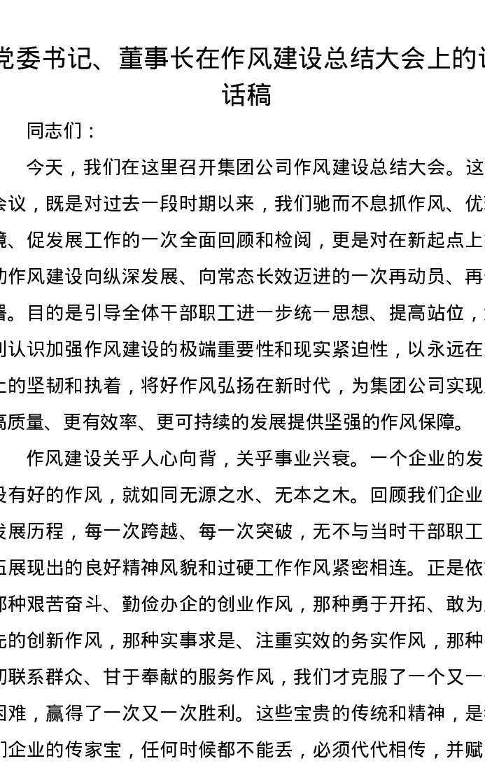 党委书记、董事长在作风建设总结大会上的讲话稿