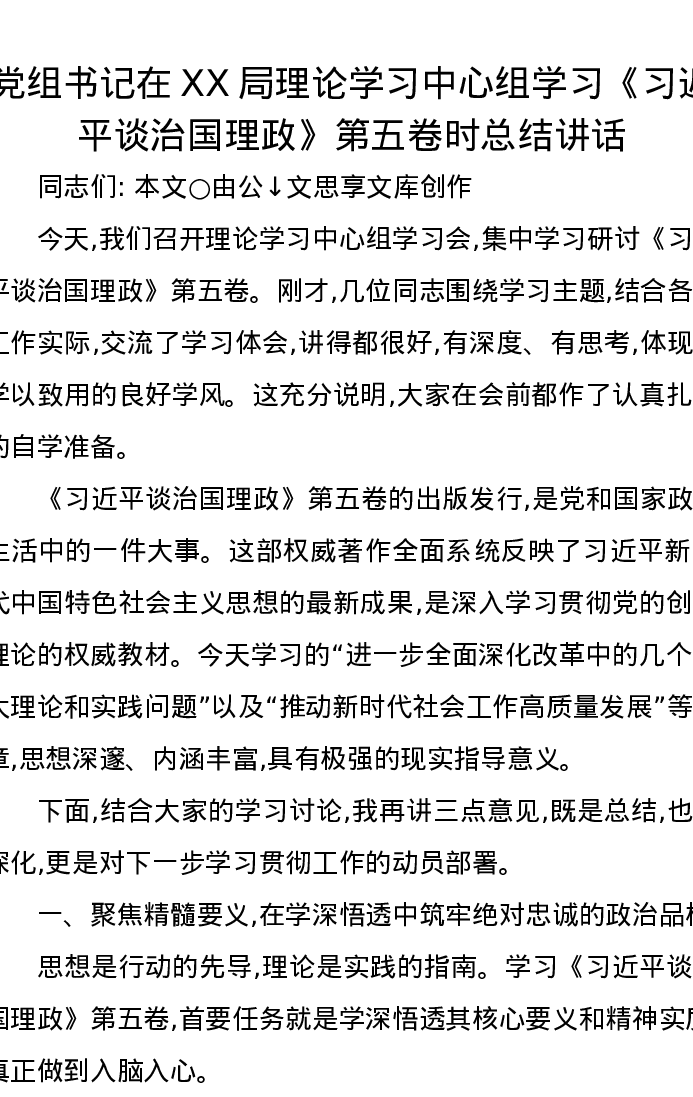 党组书记在XX局理论学习中心组学习《习近平谈治国理政》第五卷时总结讲话