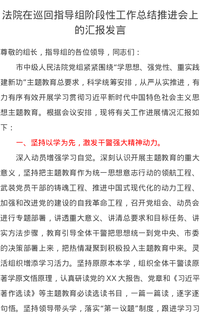 法院在巡回指导组阶段性工作总结推进会上的汇报发言