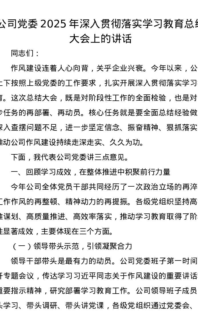公司党委2025年深入贯彻落实学习教育总结大会上的讲话