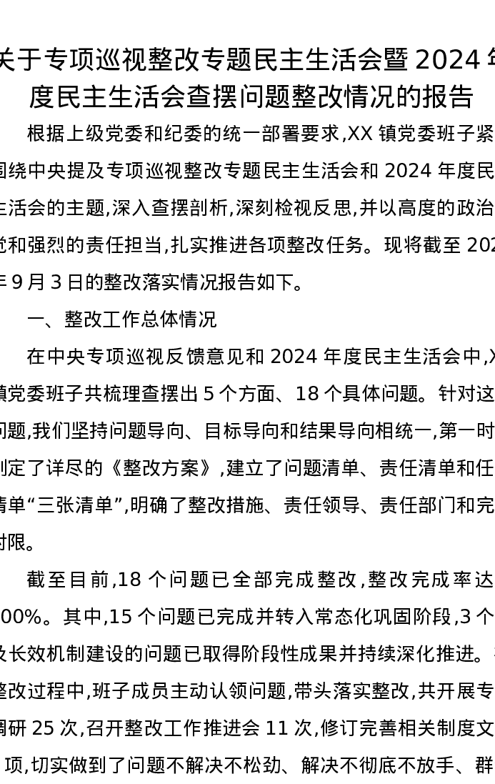 关于专项巡视整改专题民主生活会暨2024年度民主生活会查摆问题整改情况的报告