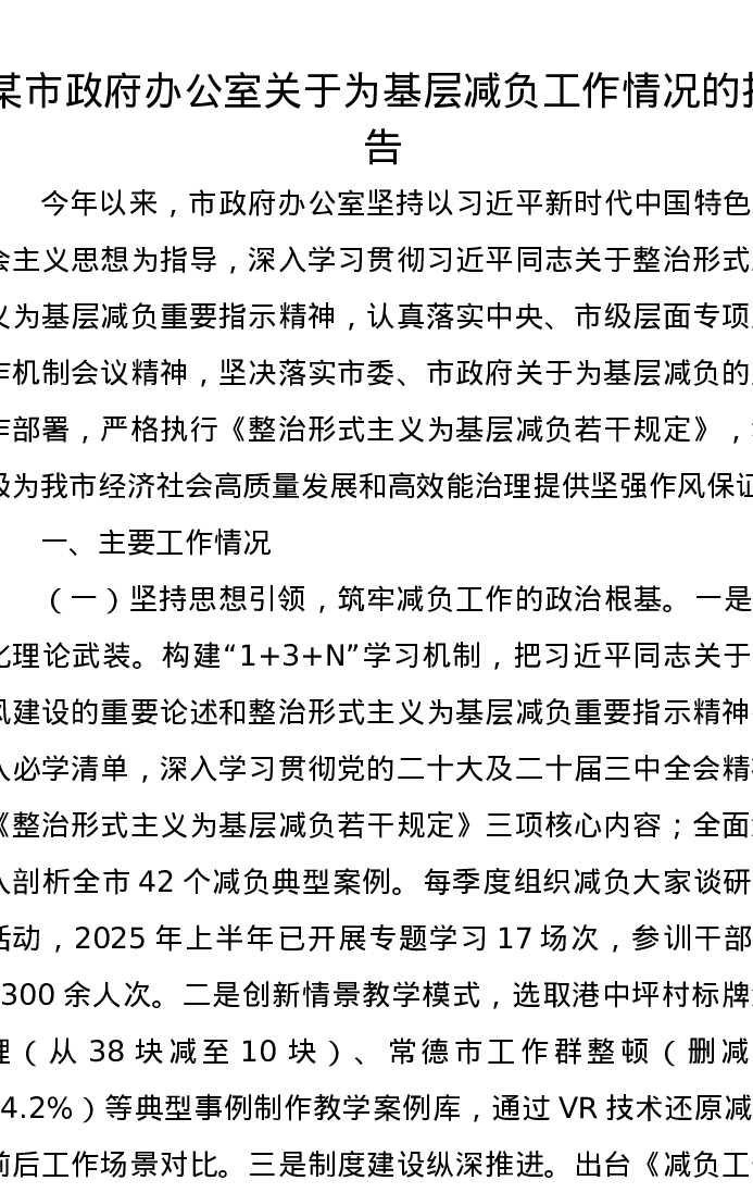 某市政府办公室关于为基层减负工作情况的报告