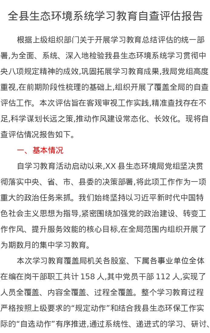 全县生态环境系统贯彻中央八项规定精神学习教育自查评估报告