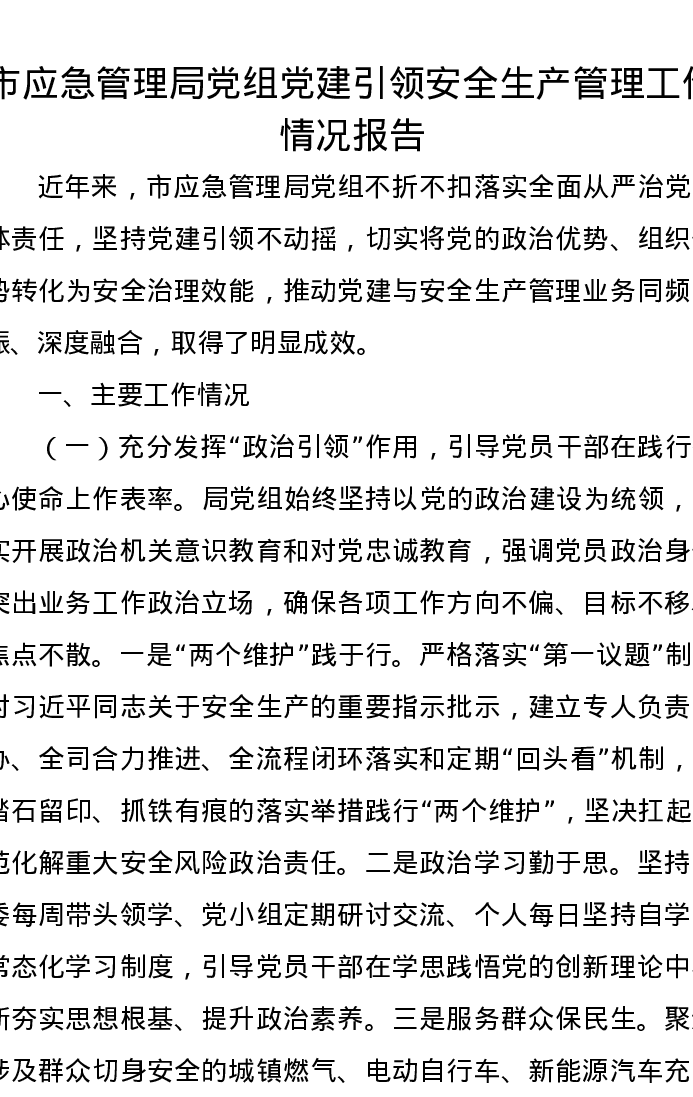市应急管理局党组党建引领安全生产管理工作情况报告
