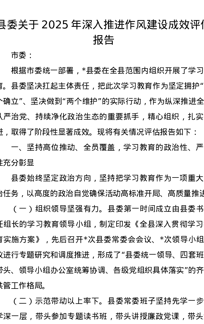 县委关于2025年深入推进作风建设成效评估报告