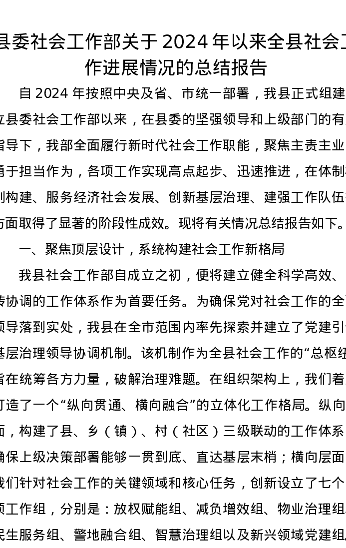县委社会工作部关于2024年以来全县社会工作进展情况的总结报告