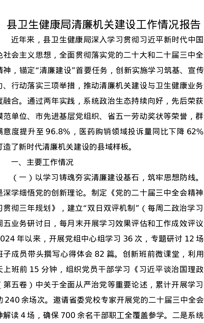 县卫生健康局清廉机关建设工作情况报告