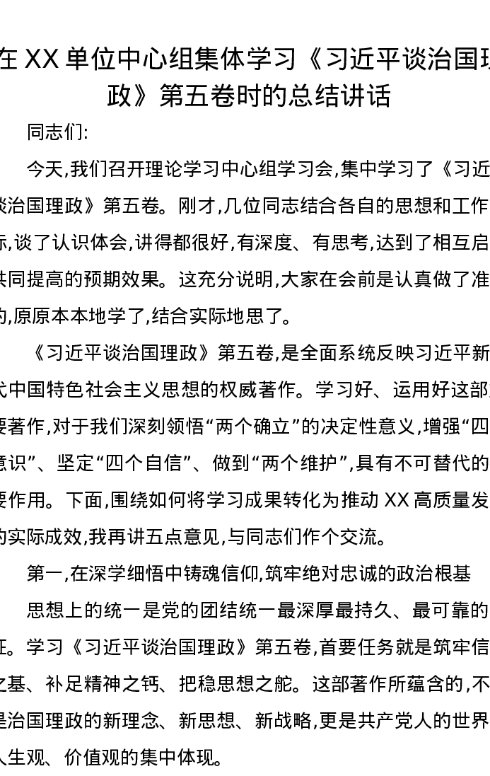 在XX单位中心组集体学习《习近平谈治国理政》第五卷时的总结讲话