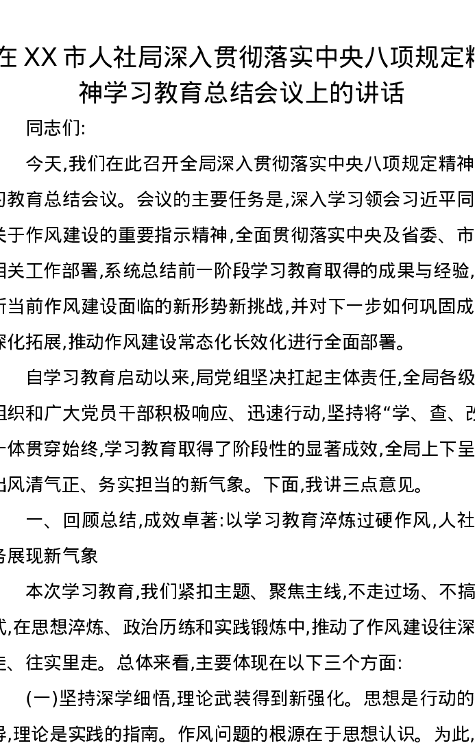 在XX市人社局深入贯彻落实中央八项规定精神学习教育总结会议上的讲话