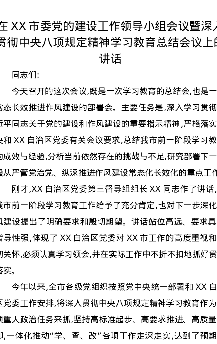 在XX市委党的建设工作领导小组会议暨深入贯彻中央八项规定精神学习教育总结会议上的讲话