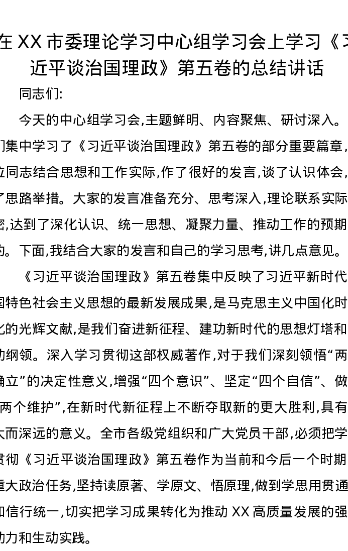 在XX市委理论学习中心组学习会上学习《习近平谈治国理政》第五卷的总结讲话