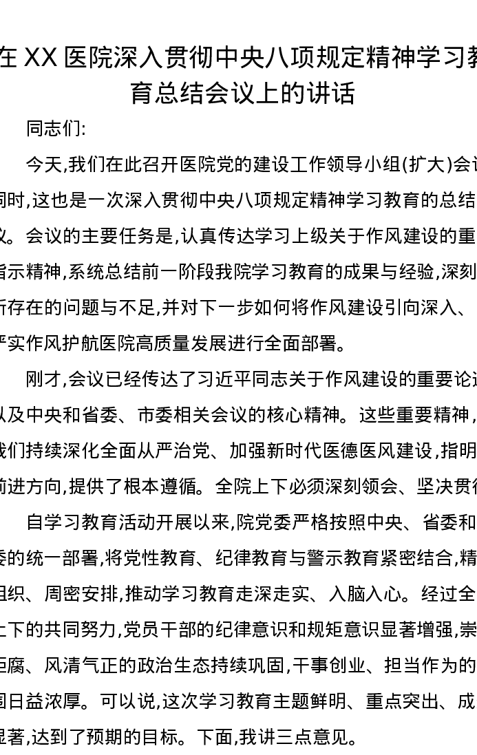 在XX医院深入贯彻中央八项规定精神学习教育总结会议上的讲话