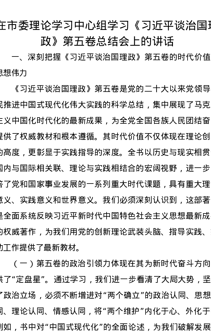 在市委理论学习中心组学习《习近平谈治国理政》第五卷总结会上的讲话