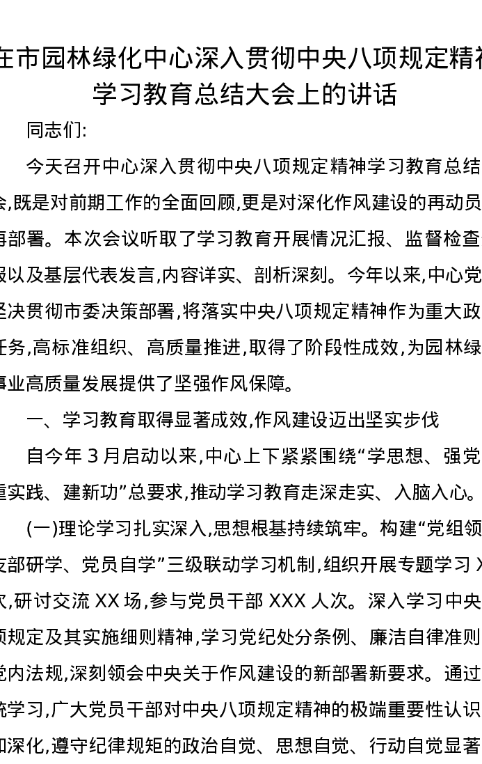 在市园林绿化中心深入贯彻中央八项规定精神学习教育总结大会上的讲话