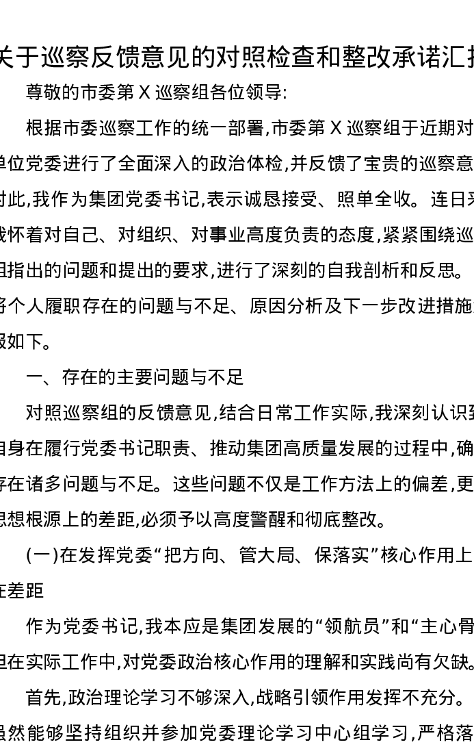 关于巡察反馈意见的对照检查和整改承诺汇报