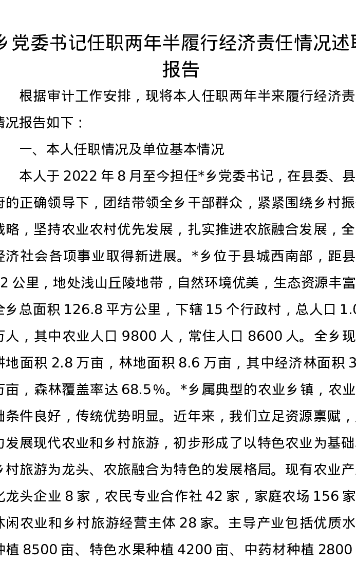 乡党委书记任职两年半履行经济责任情况述职报告