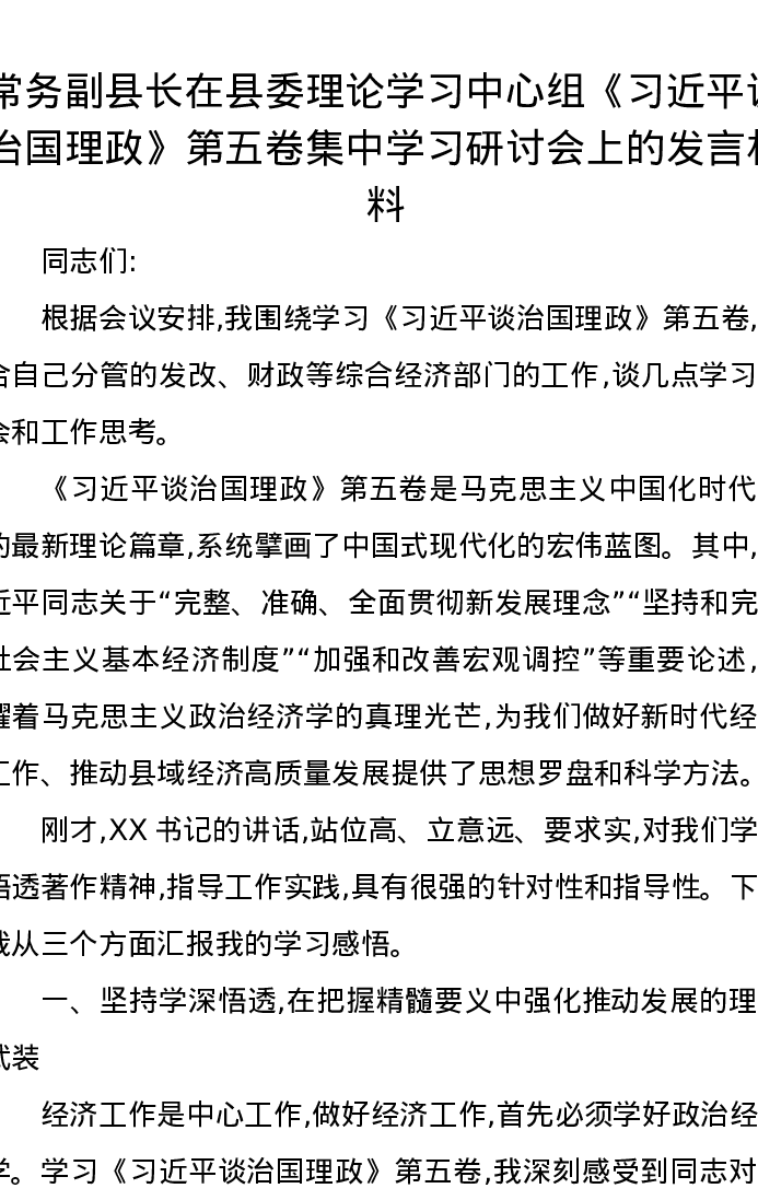 常务副县长在县委理论学习中心组《习近平谈治国理政》第五卷集中学习研讨会上的发言材料