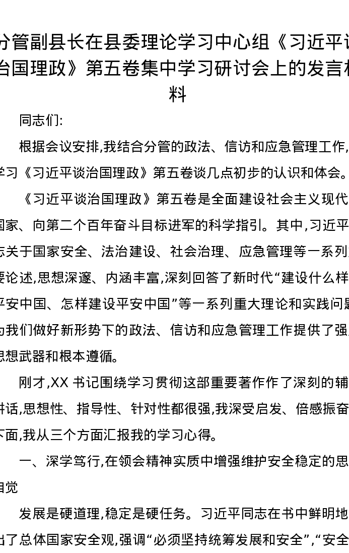 分管副县长在县委理论学习中心组《习近平谈治国理政》第五卷集中学习研讨会上的发言材料