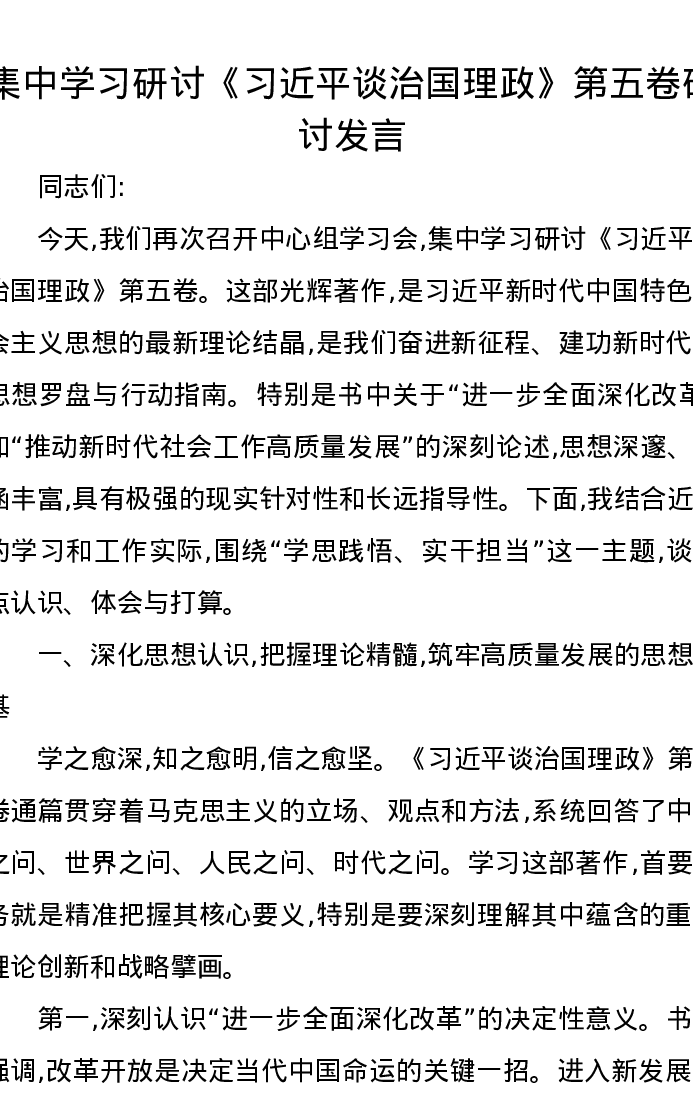 集中学习研讨《习近平谈治国理政》第五卷研讨发言