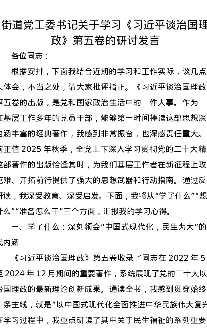 街道党工委书记关于学习《习近平谈治国理政》第五卷的研讨发言